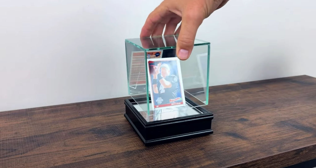 Protect and display your collectible card in this elegant mirrored display case. Designed with mirrors on the bottom and back, it provides a full, enhanced view of your card from every angle. Built with UV-protected, double-strength glass and supported by real wood molding, this case offers long-lasting clarity and durability.