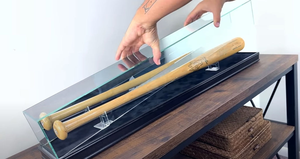 This case is the perfect display for your mini baseball bat. This mini bat display case is made of real UV Protected glass and supported by real wood moulding. It comes with two clear acrylic bat holders that can be arranged to hold your bat in either direction.